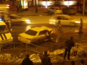 Бывает, что в столбы въезжают, но обычно просто сталкиваются... Одна авария запомнилась надолго - в троллейбус вмазалась легковушка, вылетевшшая на встречку, взлетела, перевернулась и вверх колёсами улеглась прямо на крышу стоявшей в парковочном кармане другой легковушки. С полчаса качалась на крыше, потом всё-таки съехала с неё. Не уверена начсёт водителя, кажется, он вылетел через какое-то стекло. Скорая-реанимационная долго стояла на месте, но уехала всё-таки с включённой сиреной.