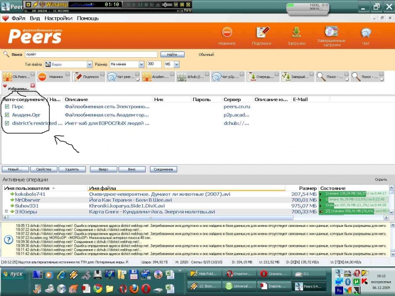 Это ты программой Peers качаешь? А к какому хабу подключаешься? Или сразу ко всем? Я в проге отметил три хаба и поставил галочки (посмотри в скрепке, я отметил кружком), но как определить, я коннектюсь сразу ко всем трём или только к одному?