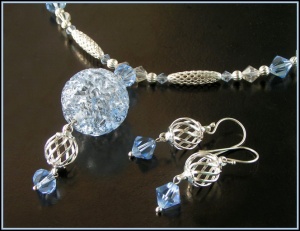 Мне в конце прошлого года привезли совершенно дивную бусину из Праги - она полая, но не гладкая, а выполненная в технике, когда стекло не выдувается, а наматывается на фрит тонкими нитками, образуя пустоту внутри. Очень такая Снегурочковая штучка получилась с ней, на посеребренной фурнитуре и с кристаллами Сваровски двух цветов:)