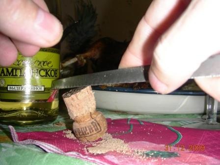 А кто нить уже шампанское открывал, нет? Я кстати, изобрёл только что новый способ обстругивания пробок от шампанского. Ножом как-то некамильфо и опасно, а вот пилкой по металлу-способ от Мишеля. культурно, неспеша и вообще. ыыы...! Вот, фота в скрепке.