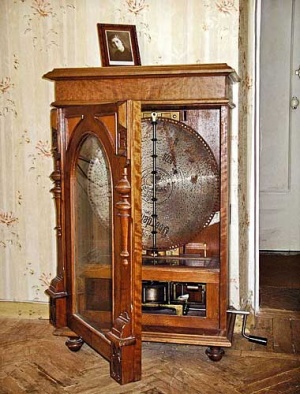 У него стояла в ремонте огромная музыкальная шкатулка-шифоньер, леший его знает как такие штуки называются, уже сделаная в части железа, как она звучала старинными мелодиями, м-ммм, закачаешься.