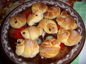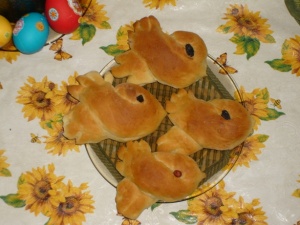 Тесто в жгут, и связываешь его узлом, надрезаешь ножницами клюв, вставляешь глазки из изюма (чё-то они в этот раз повыпали почти все), смазываешь сладкой водичкой, я ещё немного сахаром посыпала, дать постоять с пол-часика и в духовку градусов на 180.