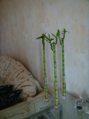 Пока они чудесно сидят в обычной воде. В Икее я напокупала подвесных глубоких ящиков с крючками. (В прошлом году - в этом, к сожалению таких уже не видно) Ящики повесила на балконные перила. Землю купила в Ашане - какую-то такую "для лиан". Вообще бамбук не капризен. Стоит себе тихонько, зеленеет, даже если не польешь ))