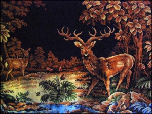 О, в моем детстве тоже были такие коврики! Сестра прабабушки вышивала гладью-крестом то, что сама рисовала. На одном были горы, лес, река, домик с цветником и пара оленей у реки. Перед сном с ним можно было играть.