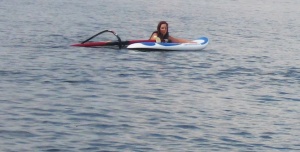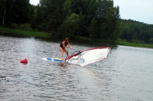 Парус поднять из воды тоже оказывается намного легче, чем мне представлялось: потихоньку сливаешь с него воду, подтягиваешь мачту и ставишь так называемые "пол паруса", то есть ловишь направление ветра себе в спину, подстраивая доску так, чтобы парус был ей строго перпендикулярен, а мачта проецировалась на нос.