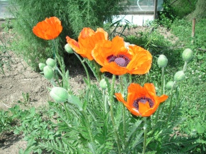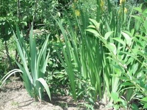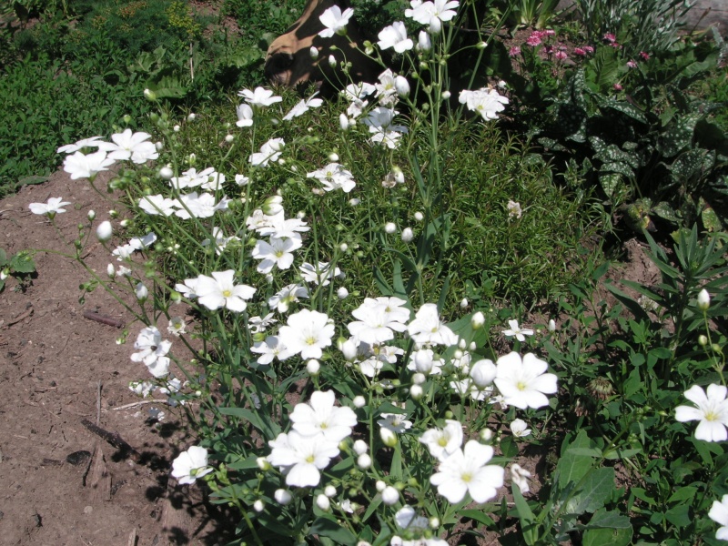 А ещё цветы: два разных ириса, справа болотный желтый, слева еще не цвел, мак китайский, гипсофила, гейхера.