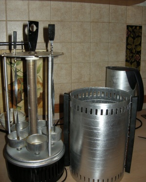 сок верхних кусочков стекает вниз, а совсем лишний в плошечки у основания шампуров