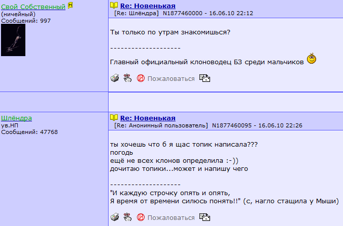 И с количеством сообщений тоже глюки. В профиле значится 998. Из под Своего Собственного под ником указано, что 998 сообщений. А из под других своих клонов вижу, что там почему-то стоит 997 сообщений (хотя, если пройти в профиль, то там значится 997).