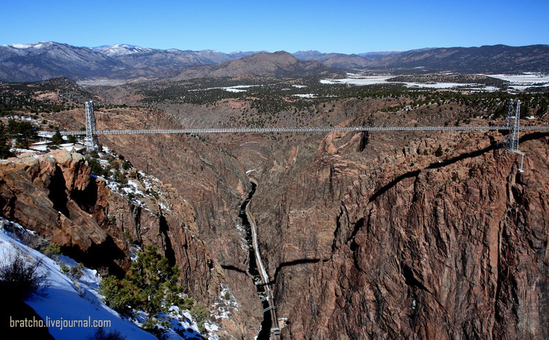 Мост парит над каньоном реки Арканзас на высоте более 400 метров. Построили сие чудо в далеком 1929 году всего за 6 месяцев, потратив на строительство 300,000 долларов ($15 млн. по сегодняшним деньгам). Длина моста - 387 метров (это как Ташкентская телевышка, если ее положить на бок), ширина висящего пролета 268 метров, высота опорных балок 46 метров, ширина моста 5 метров.