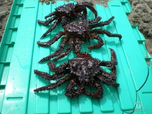 крабики. мелковаты, прямо скажем. Иногда попадались камчатьские или королевские - не помню - размах ноги полтора метра. Реально одной ногой можно натрескаться.