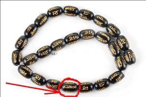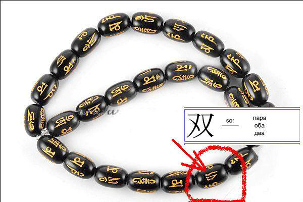 Вообще-то, судя по абсидиановому цвету бус, там должны быть письмена майя, ну или стилизация под них. А если уж брать восточную письменность, то бусы надо было делать цвета глиняных табличек, светло-коричневенькие.