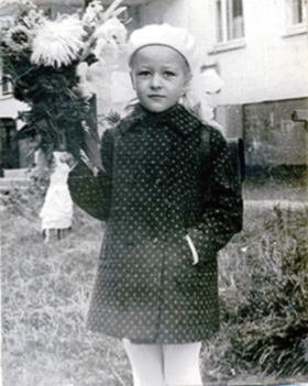 Все в платьицах и костюмчиках, одна я, как не знаю кто, в плаще и тоже в берете. И выше всех.