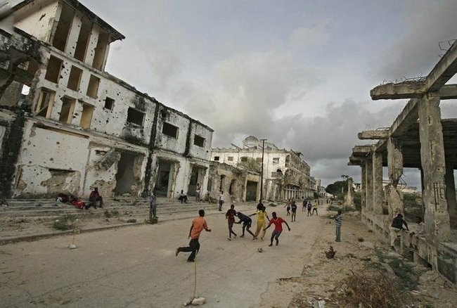 Тут художественный приём, тут не документалистика, фотограф хотел показать, что мир (здания) рушится, а жизнь (дети) всё равно продолжается несмотря ни на что. На твоём фото завал зданий как раз оправдан.