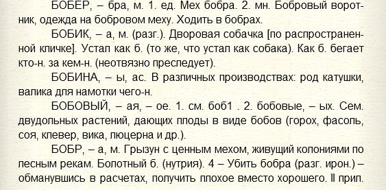 Мех, шкурка этого животного; изделие из него. Шапка из бобра. Пальто отделано бобром. < Бобриный, -ая, -ое. Б-ая тропа. Бобровый, -ая, -ое. Б. заповедник. Б-ая шуба. Б. воротник. Бобрёнок; Бобриха (см.).