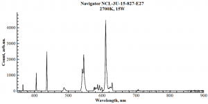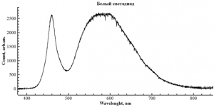 Спектральный график излучения белого светодиода имеет совершенно другой вид (второй график).