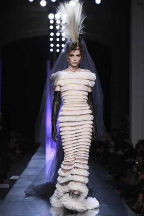 Короче, Готье молодец. Я считаю, что осуществил прорыв и вообще сделал логичный шаг. Зачем искать женщин с мужскими параметрами, если можно спокойненько взять в модели готового мужчину? "Невеста" - парень, модель Андрей Пежич.