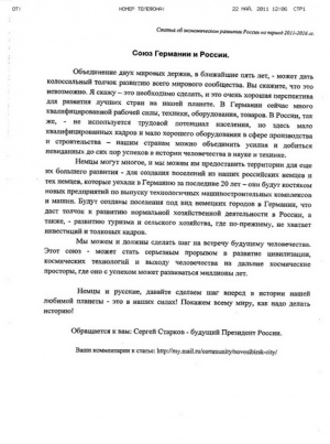 А мне на работу СТСсиб письмо прислал в духе русские и немцы пхайпхай. В конце письма скромная подпись "Сергей Старков будущий президент РФ". Вот думаю нести директору или себе на память оставить