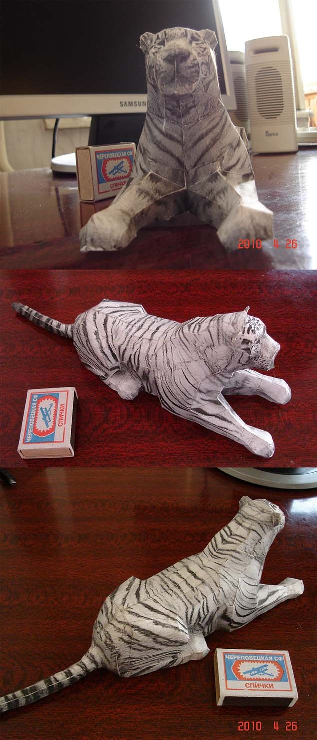 Вот этого тигра мой Рома сначала сделал в компьютере, потом распечатал выкройку и склеил. Но перед этим он специально делал выкройку угловатой\, чтобы рёбра склеивать.