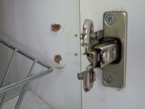 опилки разводят с эпоксидкой, залепляют дырки. Но это все равно не надолго. А если чуть выше или ниже сверлить, боюсь, дверцы будет трудно уравновесить