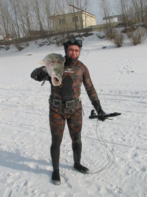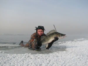 достаю фотик из сумки, он машет что не надо, потом разобрался что рано... лед тонковатый см 3-5 типо наледи... , Витя ленива вываливаливает пробитую гарпуном судачиху на кромку льда.. ну нармальная кг на 6-10 и счастливый такой:)