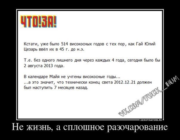 Вот интересно, те, кто расшивровывал календари майя, тоже не знали о високосных годах? Или они только тупо переводили с майского на июньский? Вот откуда такие умники берутся, которые считают, что у всех, как и у них, не хватает ума ни на что, кроме демотиваторов?
