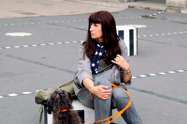ну вот например типичная парижанка с собакой... шарфики варьируются, но наверчены всегда на шею. Куда француженка без платка или шарфика на шее?