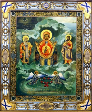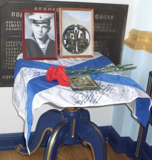 На столе капсула с его именем, изготовленная в Александро-Невской лавре, настоящий флаг К-8, который перед походом заменили на новый, он как-то по особому называется, узкий с двумя хвостами, и икона "Спасающая на море путешествующая". Эта икона написана на гибель Курска, но уже стала символом не только Курска, но и всех, разделивших участь Курска тоже. Путешествующая- единственный список со "Спасающей на море", которая хранится в Видяево, а вторая В Питере. В Киселевске она ночевала на андреевском флаге в храмовом комплексе.