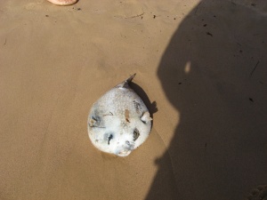 Рыба - шар вроде так?? Их там дофига, по мелководью шастают, когда опасность - надуваются вот так, эта бедняга отчего и не сдулась перед смертью. Может на крылатку напоролась??
