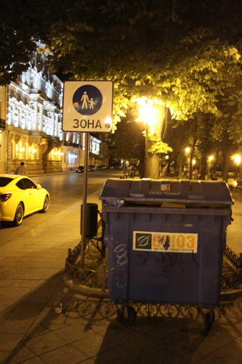 Мы в Одессе тоже натыкались на такие стоящие среди улицы контейнеры. Вот, например, с вечерней прогулки. Это Приморский бульвар, недалеко от лестницы.