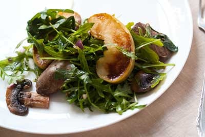 На фотке выглядит так себе, но вкус прям чудесный. Кисло-сладкие заправка и яблоки + резковатая руккола солируют, печень и грибы подыгрывают.
