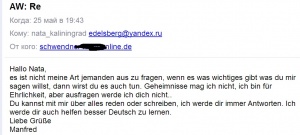 Представьте, пишет какой-то Манфред, коротенький, 183, 53 годика, хорошая фигура, красивый..нос прямой породистая немецкая внешность......