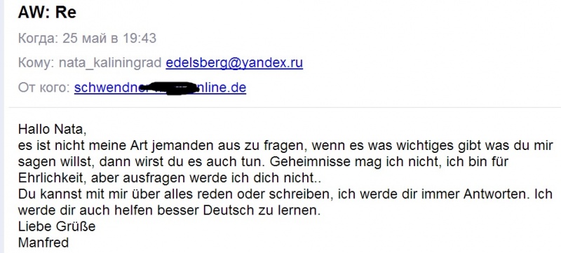 А тайн я не люблю, неет...и спрашивать, мол, не буду я тебя !Так что давай, пиши...Ну я тебе немецкий подмогну подучить, всё-такое...."