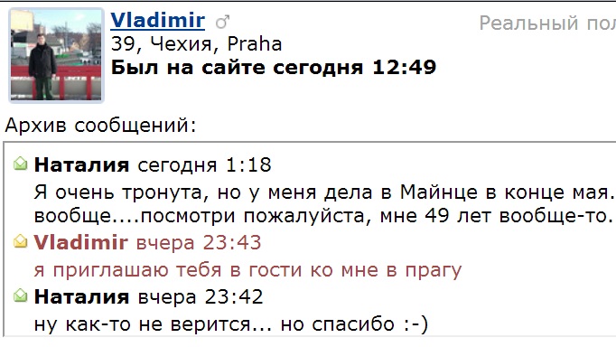 Немчик номер 4, очень красивый, брюнет с голубыми глазами....которому 47 лет, рост 190, работает прорабом на стройке, обещал мне неделю назад, что в четверг напишет, как приедет из пасхального отпуска. Я только ухмыльнулась про себя и пожелала ему хорошего отпуска. И, благо, что я ещё не привыкла к нему, забыла о нём...Ну не забыла, конечно...но отпустила мысленно свободную водолейскуб пташку :-)