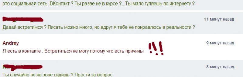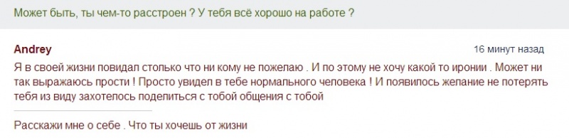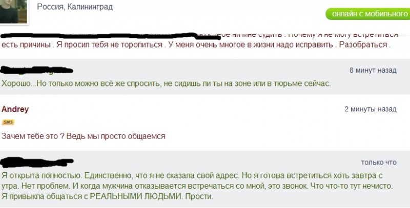 Знаешь..я подумала, что этот красавец может ведь из зоны писать. Он сейчас на связи, пишет с телефона и задумчиво намекает на какие-то обстоятельства, которые он в жизни перенёс....хм.. Открыто не говорит..