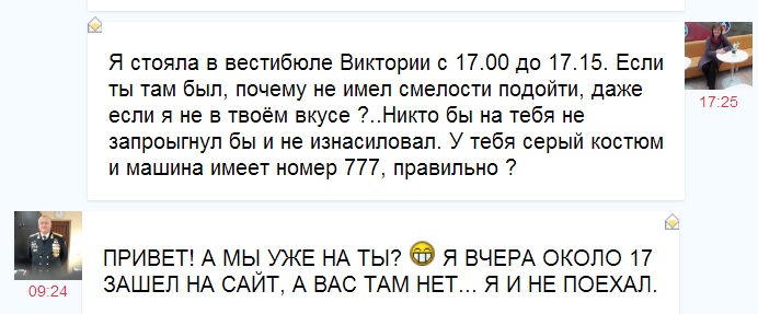 1. Орденоносец выше по топику. Назначил мне свидание на 17 часов, предварительно выспросив мою жизненную историю. Я пошла как правдашняя, стою, жду. Время 17.02.