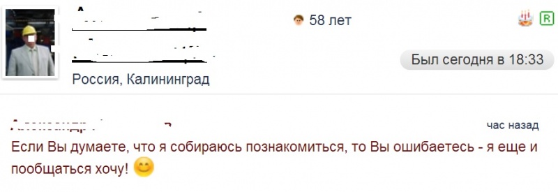 А вот другая крайность. Повадился пописывать какой-то молодой, 42 годика...Очень красивый, очень молодо выглядит...НО это тоже перебор. Он любит Femdom и каждый раз просит, чтобы наконец уже встретиться, и перечисляет, как он любит, когда баба его заставляет...ЧТО она заставляет, и ЧТО и КУДА ему вставляет...уффффф....