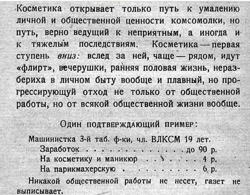 Сперва накрасят губы и ногти, выдернут волосы из ног, подмышек и усов, а потом наступает прогрессирующий отказ от общественной работы. Всё так и есть! Им бы только о стрингах думать!