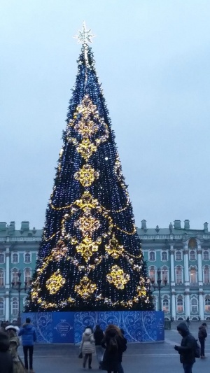 Кстати, о Питере. Улицы, в сравнении с М., украшены...ммм...сдержанно. Елка на Дворцовой как советский ребенок на казенном утреннике - сверху парадное платьице, снизу рейтузы и валенки. Подиум, затянутый сеткой убил " галуны" из игрушек.