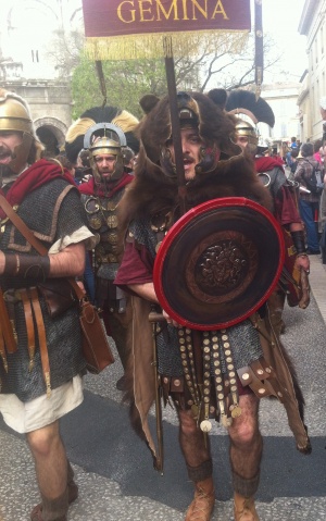В частности, они воссоздали несколько легионов - знаменитый XIII парный легион GEMINA с его штандартами с изображением единорога, YIII Августов легион (Галльский) с эмблемой быка, еще какие-то легионы тоже с быком, но другим... Они на проходах несут свои штандарты, а эмблемы на щитах. Командуют начальники их на латыни, они очень громко ревут хором в ответ на какие-то команды, все очень грозно и аутентично...