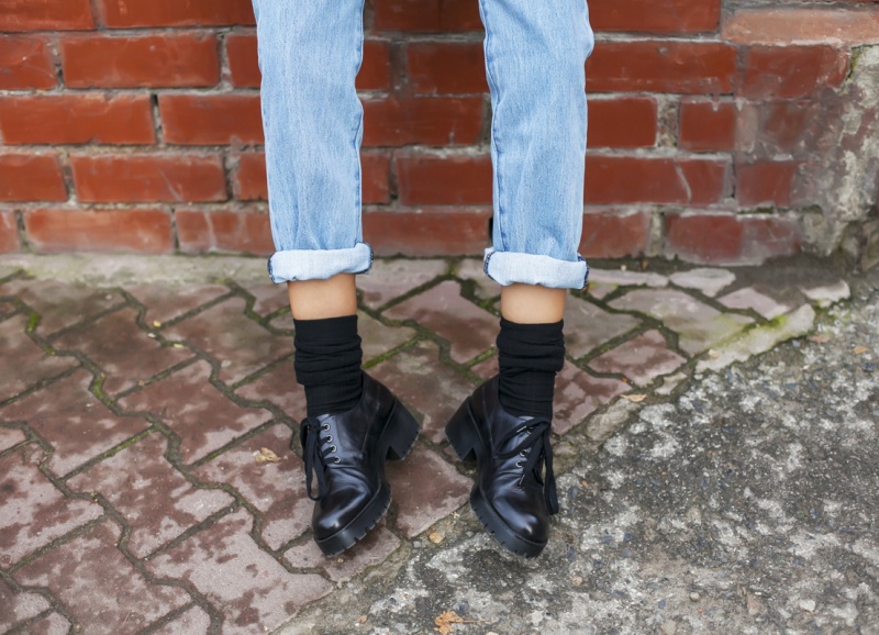 Насыщенно-бордовые сюда, конечно же, низко вырезанные, открывающие косточку, ботинки на протекторе и квадратном каблуке, и серый носок.