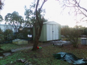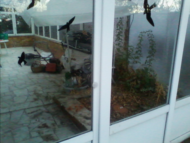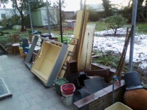 Вот в этом "зимнем саду" надо убирать весь этот рассадник.. Там растёт плетистая роза, которая своими корнями уходит куда-то под фундамент.. Когда я первый раз увидела эту веранду в апреле прошедшего года, она запустила свои шипы во всё, что там стояло. (А стоял тот хлам, что сейчас на территории под навесом..) Все эти вещи были густо заплетены розой, пылали кровавые цветы... Она воткнула колючки даже в резиновые уплотнители окон...