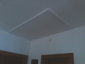 Когда подцепляешь вот эту дверь на потолке, оттуда выезжает лестница в 2 пролёта, которая ведёт на мансардный этаж... на котором НЕКУДА ШАГНУТЬ от вещей, оставшихся от родителей НМ...