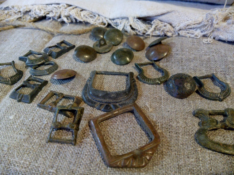 это там домоткани из крапивы и конопли, середины прошлого века. пуговки 18-19вв, а пряжечки есть и 12-13 вв