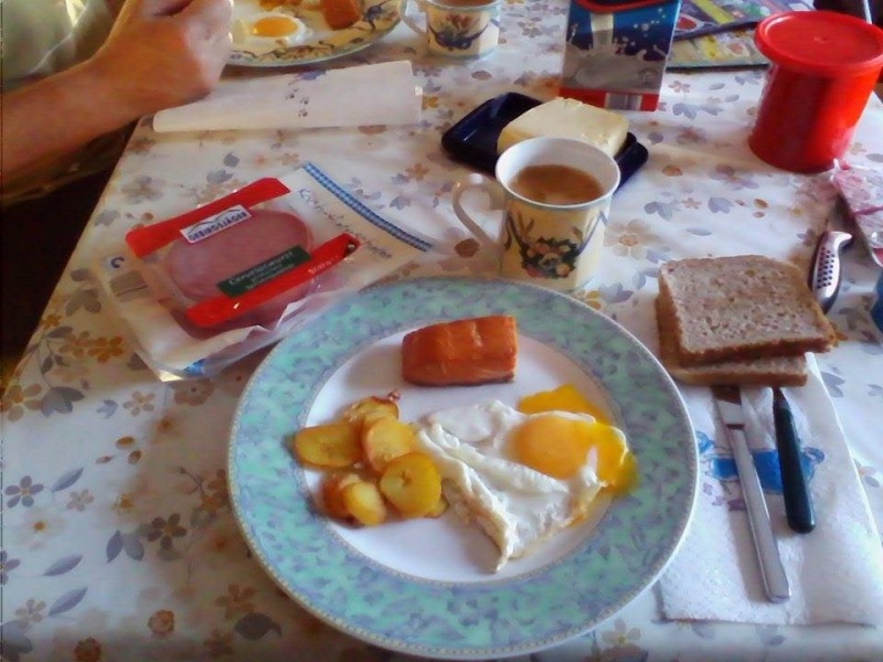 И завтраки у нас стали более, чем демократичные, нет уже этих обязательных тысячи блюдец, правильно разложенных вилок-ложек и прочего официоза ))) Сидим запросто, как в колхозе, он одним глазом в тарелке, другим в газете, я в окно на птичек любуюсь.. Я на дереве кормушку подвесила и синички местные толстенькие разбалованные там прыгают.