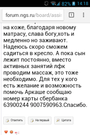Кто по ссылке не ходил , внизу скриншот со страницы с номером сбербанковсой карточки матери Аркаши. Если кто положит даже 500 рублей, это будет как подарок к Пасхе, я думаю. Естественно, такие ҡороткие акции ничего не решат.