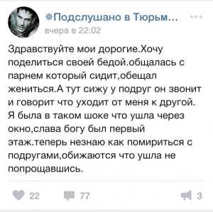 Друг мой, ну вот ты мне объясни, зачем теткам это все надо??? Я еще понимаю, когда жили-жили вместе, а потом раз - и роднуля фуфайку со склада умыкнул, 2 года дали и жена дожидается. Но зачем тетки с заведомым зэчарой жизнь стремятся связать?