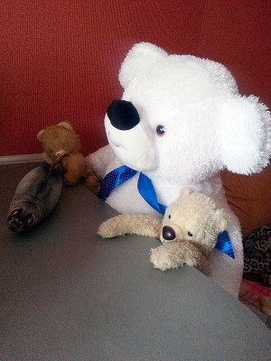 Огромный медведь, подаренный на годик дочери, прожил у нас не долго. Оч быстро сломался, порвался и выбросился...и хорошо...доча молодец