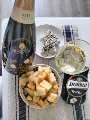Долго лежала бутылка asti. Оказалось что в сочетании с голубым сыром и дыней это гастрономическая бомба. Вино холодное, дыня и сыр теплые. Под любимый сериал.