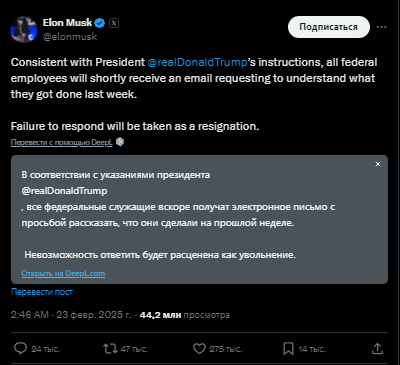 Маск безусловно гениальный визионер, но специалист подобен флюсу полнота его одностороння. Я не верю что Илон гениален и в государственном строительстве. В любом случае сложные системы требуют большой и разветвленной бюрократии и там естественно образуется здоровый жирок от 10 до 30%. Желание сократить бюрократию понятно и поддерживаемо охлосом, но чтобы сократить её радикально придется упростить гос. системы, институты и т.п., т.е. в итоге прийти к авторитаризму или анархии. Будем посмотреть.
