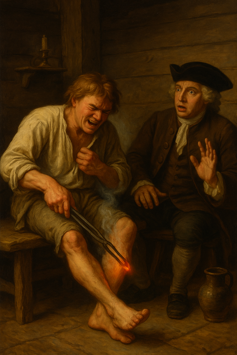 6 мая (суббота) Капель рассказал, какое чудное лечение производит от зуда в ногах русский малый Ванька [Иван Сутимцев (Вероятно, имеется в виду 14-летний русский мальчик Иван Путинцев, купленный Мессершмидтом ещё перед началом экспедиции для всяких работ по сбору коллекций)], а именно: он берёт щипцы, каковыми со свечи снимают, держит их над огнём и разогревает так, что невозможно к ним пальцами прикоснуться, после чего начинает ими царапать и скрести себе кожу.